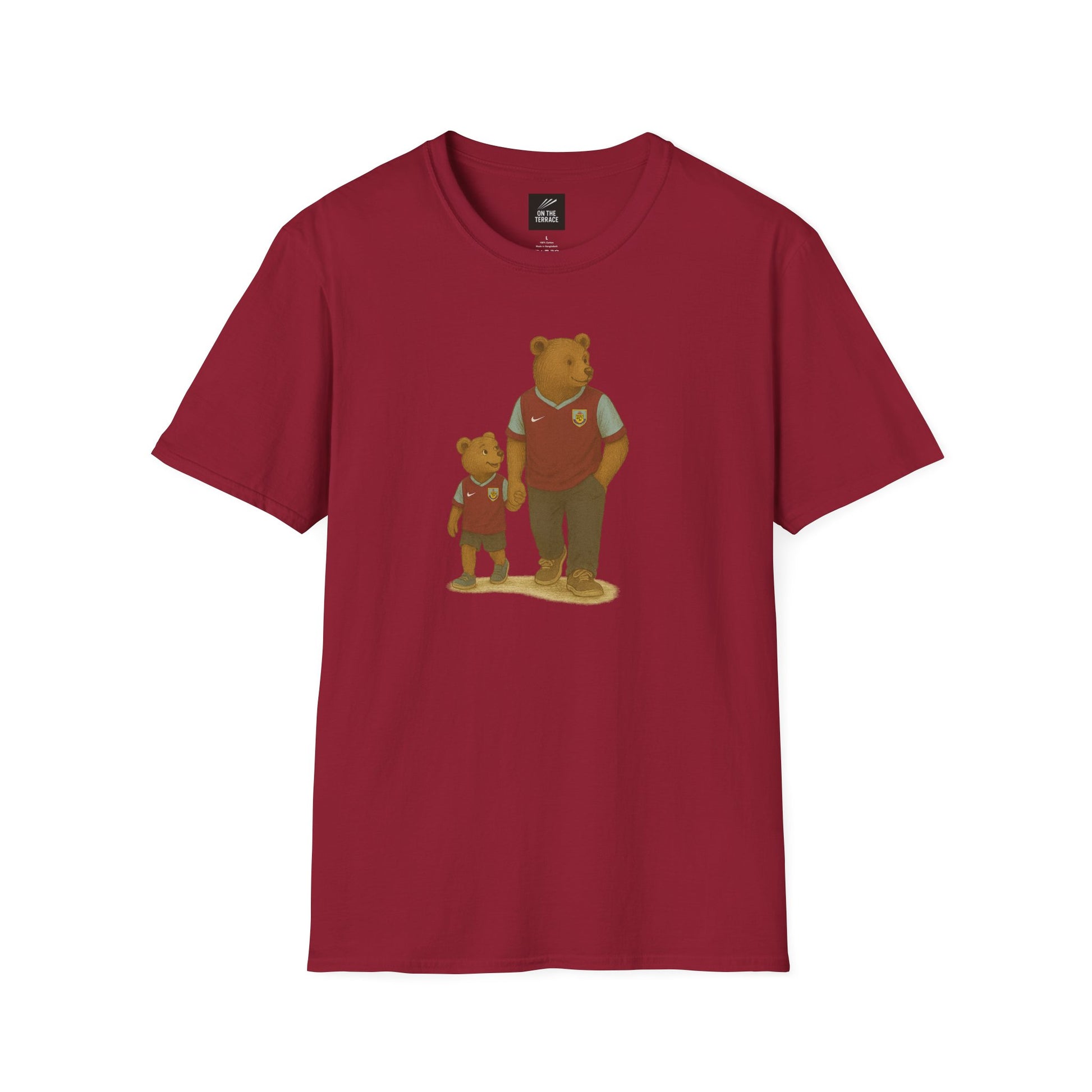 This Burnley-inspired t-shirt is pure Turf Moor blood: a beautiful illustration of two bears—a proud dad and his little cub—hand-in-hand, both wearing classic claret-and-sky home kits with the famous Clarets crest on the chest. Designed by On The Terrace, the iconic graphic is printed using DTG (Direct-to-Garment) technology, ensuring a crack-free, fade-resistant finish that fuses deep into the fabric for ultimate durability.