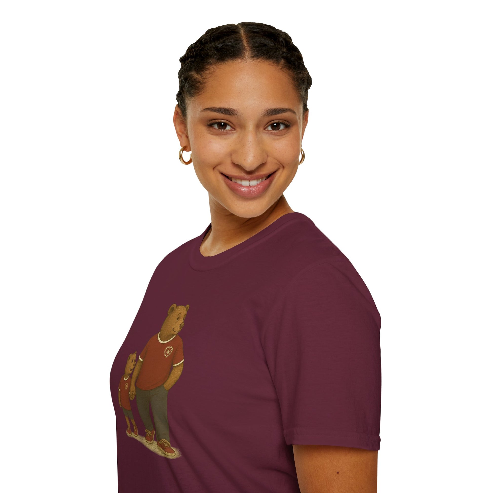 This lightweight, ring-spun cotton tee brings a gentle, storybook warmth to everyday wear. A soft maroon canvas holds a hand-illustrated scene of two bears — an older, steady figure and a smaller companion — evoking quiet moments of guardianship and simple family rituals. It's meant to be worn on slow weekend mornings, casual walks to the coffee shop, or while lounging at home with someone you care for. The breathable fabric and classic crew neck make it comfortable from season to season. The design reads as nostalgic and sincere, a subtle way to carry a comforting memory with you when you step outside.